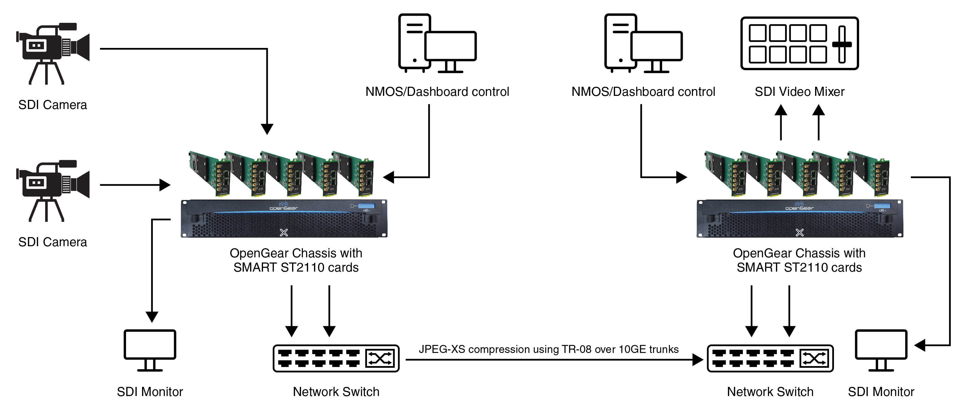 The SMART openGear ST2110 provides 12G/6G/3G/HD-SDI to ST2110 Encapsulation and De-Encapsulation with TR-08 JPEG-XS encoding and decoding. This is the perfect solution for delivering enhanced functionality to address bandwidth efficiency and high-quality video, low latency, compression requirements using two 10GE trunks for seamless protection switching.